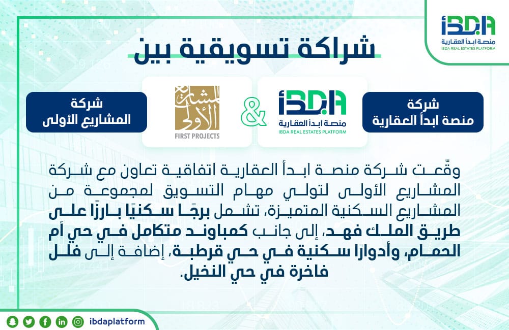 وقّعت شركة منصة ابدأ العقارية اتفاقية تعاون مع شركة المشاريع الأولى لتولي مهام التسويق لمجموعة من المشاريع السكنية المتميزة، تشمل برجًا سكنيًا بارزًا على طريق الملك فهد، إلى جانب كمباوند متكامل في حي أم الحمام، وأدوارًا سكنية في حي قرطبة، إضافة إلى فلل فاخرة في حي النخيل.