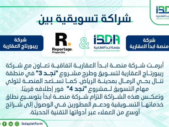 وتأتي هذه الشراكة ضمن استراتيجية منصة ابدأ لتوسيع شراكاتها مع مطورين متميزين، وتعزيز حضورها في سوق العقار السكني في مدينة الرياض.