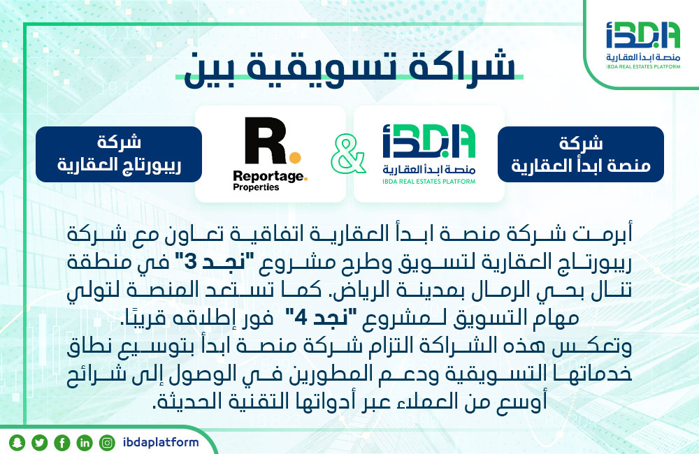 أبرمت شركة منصة ابدأ العقارية اتفاقية تعاون مع شركة ريبورتاج العقارية لتسويق وطرح مشروع “نجد 3” في منطقة تنال بحي الرمال بمدينة الرياض. كما تستعد المنصة لتولي مهام التسويق لـمشروع “نجد 4” فور إطلاقه قريبًا.